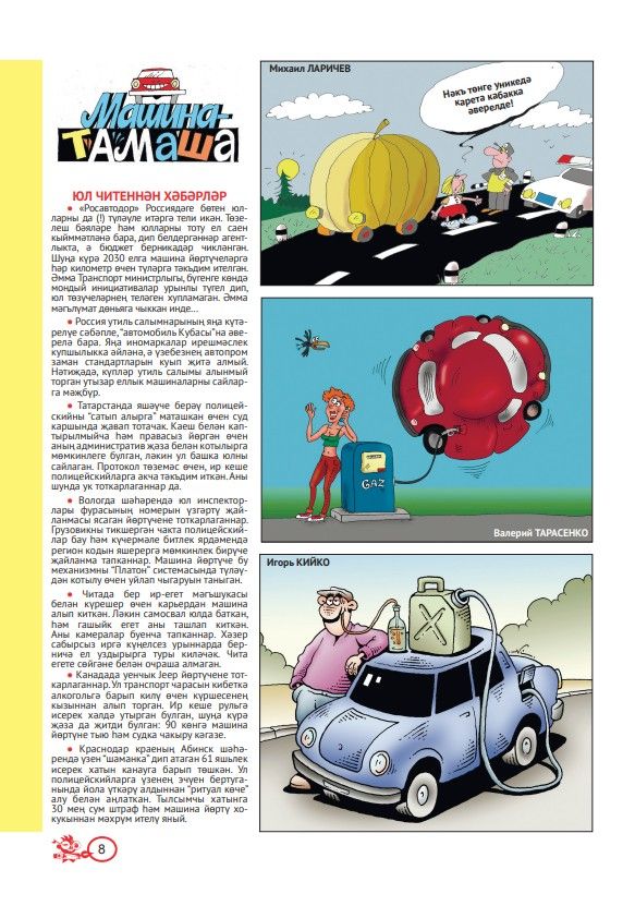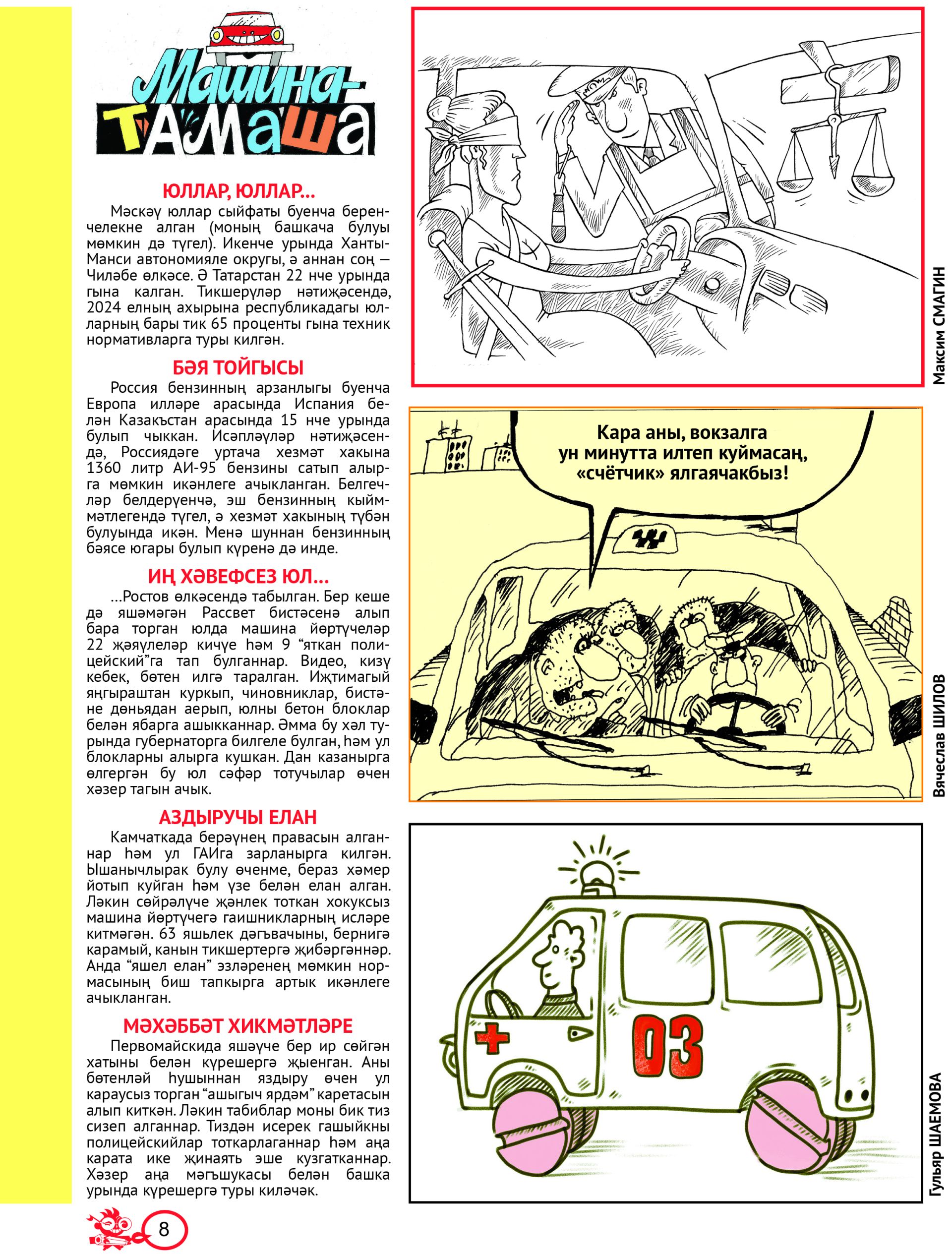 Оставьте реакцию на материалМашина-тамаша № 9 (тат)3 октября 2025 - 12:34  Подборка заметок «Юллар, юллар…» («Эх, дороги»), «Бәя тойгысы» («Бензин в ощущениях»), «Иң хәвефсез юл...» («Самая безопасная…»), «Аздыручы елан» («Змий-искуситель»), «Мәхәббәт хикмәтләре» («Любовь зла») в переводе на татарский, рис. Максима Смагина, рис. Вячеслава Шилова, рис. Гульяр Шаемовой